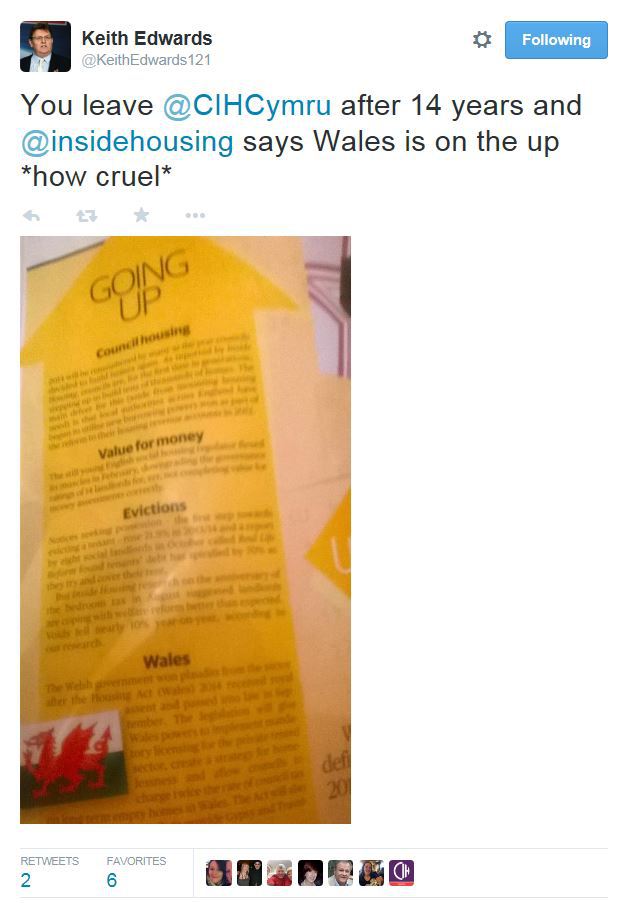 Oh dear… we’ve just seen that Keith Edwards, who recently stepped aside from the role of CIH Cymru director, has issued a howl of despair (via Twitter) over Inside Housing’s 2014 review of the year. Our review, in last week’s magazine, said that ‘Wales is on the up’… shortly after Mr Edwards left the role. Oops.