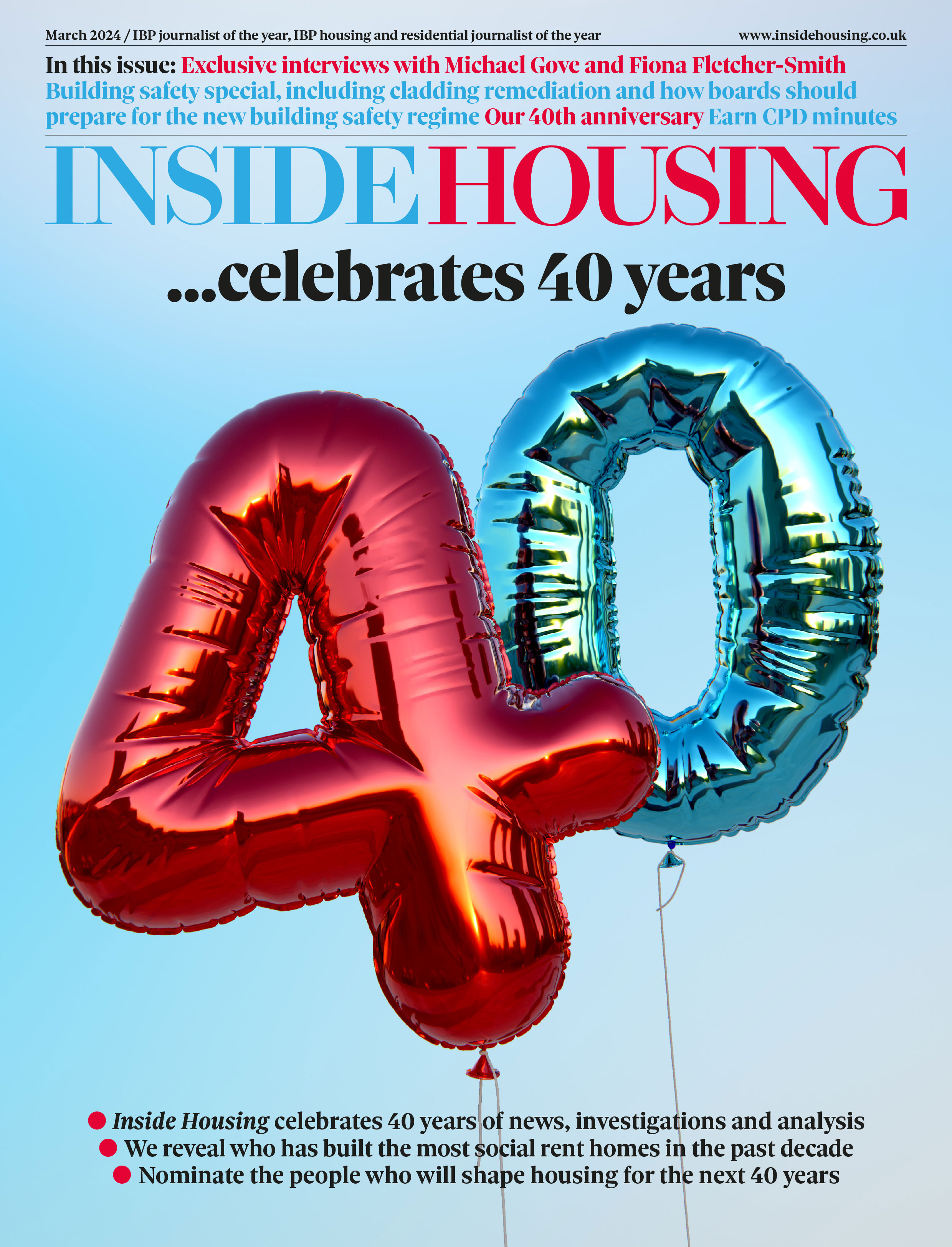 Inside Housing’s 40th anniversary issue celebrates four decades of news, investigations and analysis, reveals who built the most social rent homes in the past decade, and asks you to nominate the people who will shape housing for the next 40 years; building safety special, including progress on cladding remediation, how boards should prepare for the new regime, and earn CPD minutes; plus exclusive interviews with Michael Gove and Fiona Fletcher-Smith, as well as more features and the latest news and comment