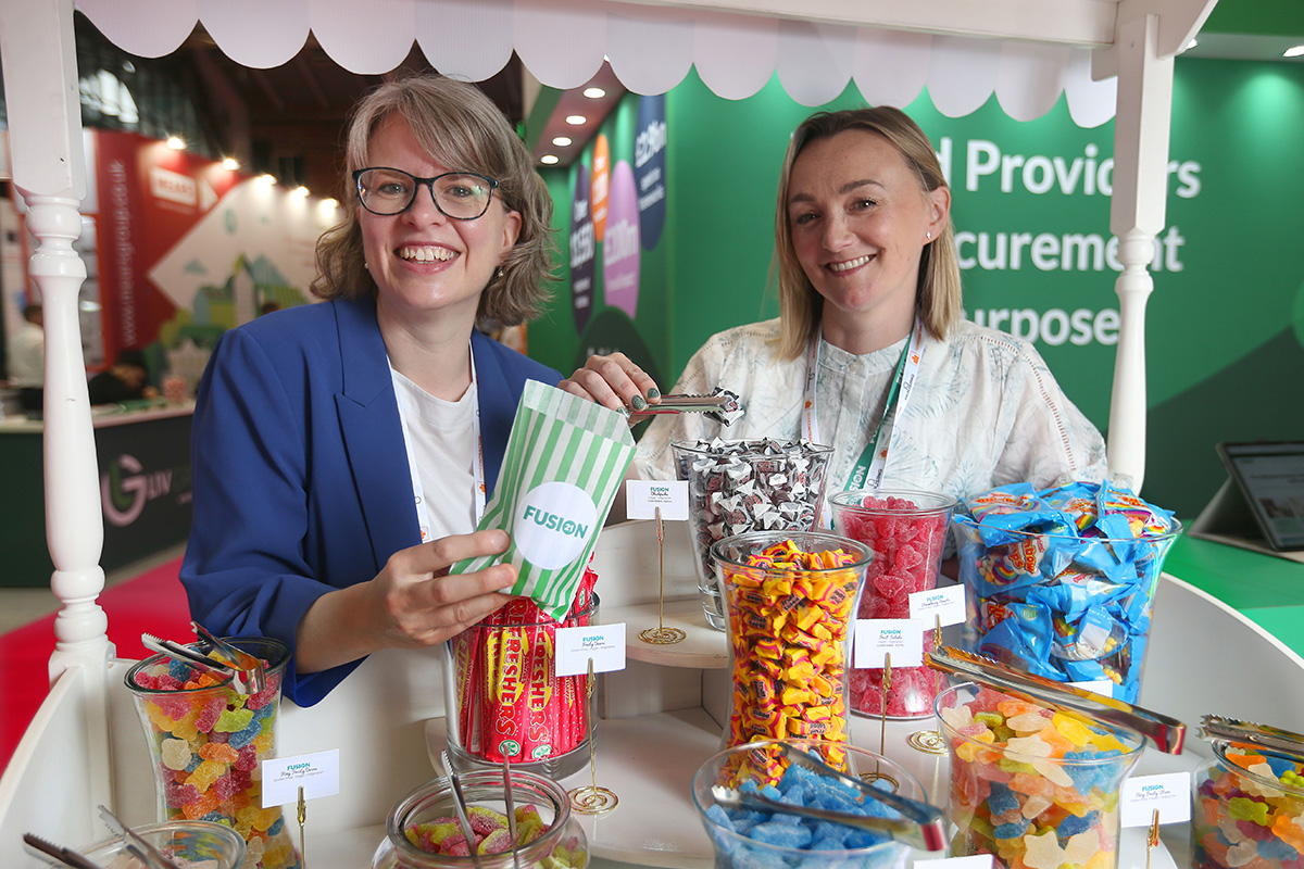 Jo Hannan (left), head of foundation, and Sarah Maguire, head of social value, pick sweets at the Fusion21 stand