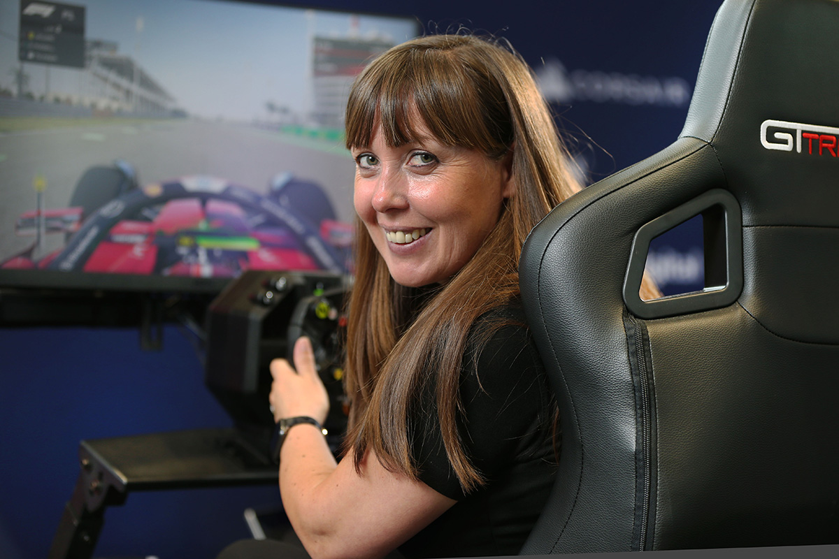 Cheryl Humberstone racing cars on a simulator at the VIP UK stand