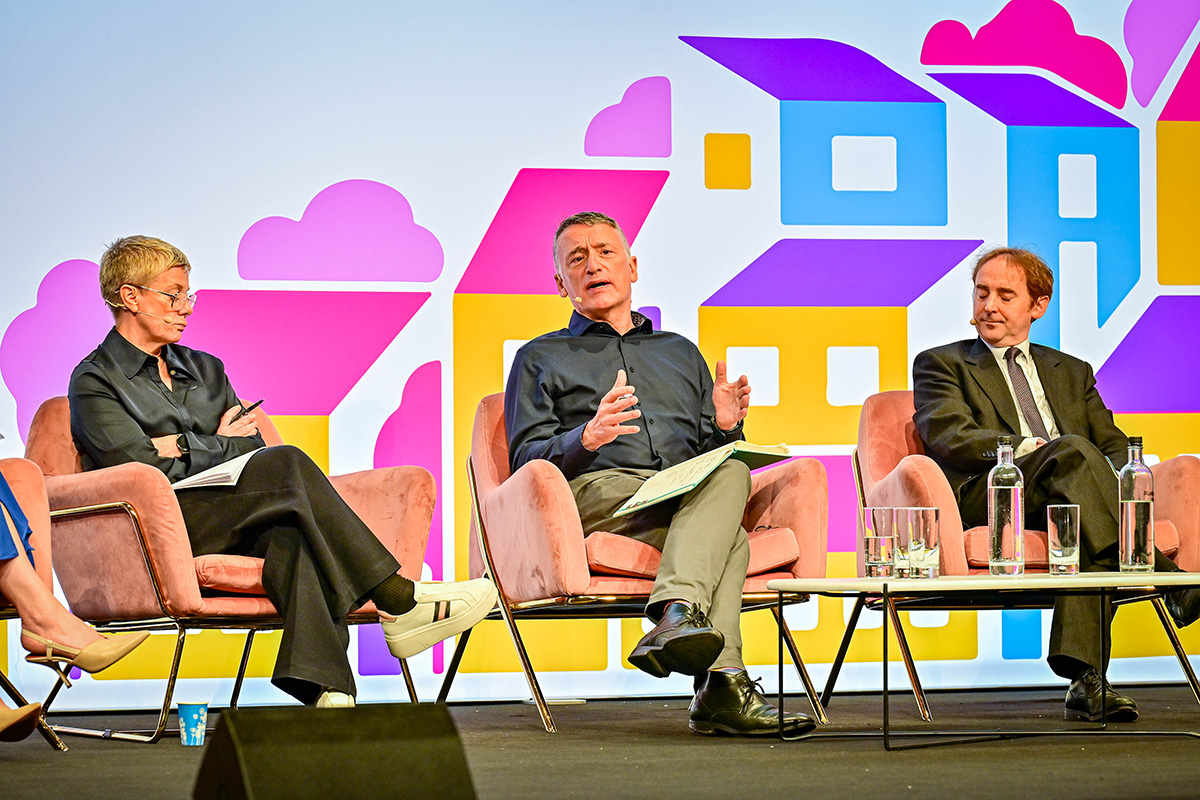 L-R: Kate Markey of Nationwide Foundation, Ian McDermott of Peabody and Patrick Murray of the Northern Housing Consortium on stage during the session called ‘Providing affordable housing for all – analysing the government's housing strategy’
