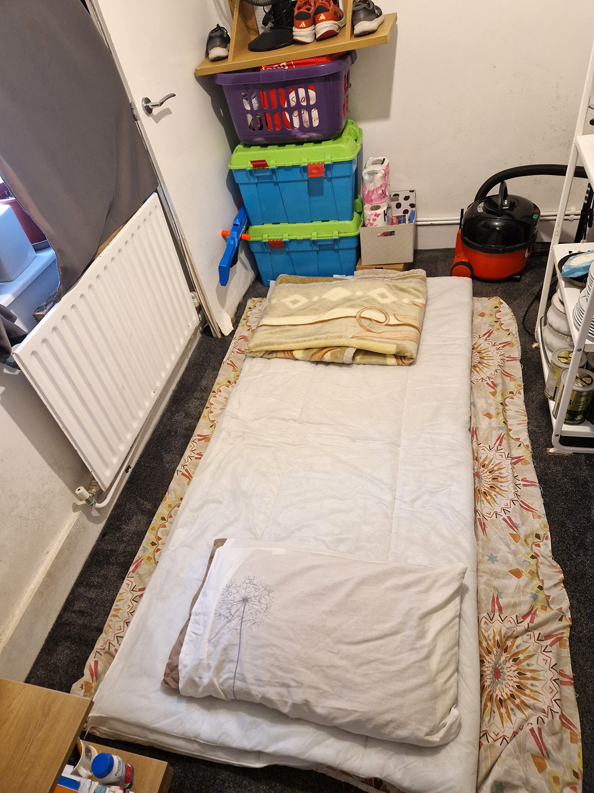 Amir*, her 10-year-old son, sleeps in the smaller bedroom, on a foldaway mattress on the floor. Barely larger than the mattress itself, the room is damp and mouldy. Ms Houssein shows me the black spores spreading across the wall, which she tells me she wipes every day, and she also has to pack away Amir’s bed every morning to stop the mould reaching it. One winter, mould got through Amir’s dresser and into all his clothes, so now all their clothes are stored in the main bedroom.