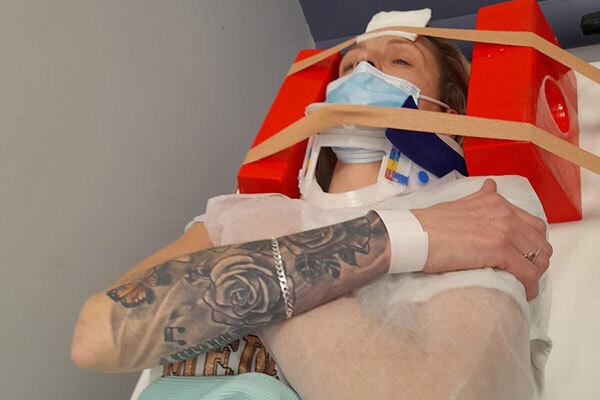 Tracy Cordery was admitted to A&E on Sunday night after the incident at her house in Morden, south London, left her in a neck brace (pictured below).